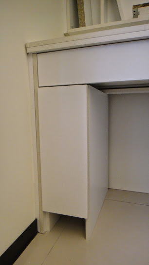 主臥的化妝台就比較複雜了,除了缺門板,屋主還特別要求加裝T5燈管!其實,店長也覺得這個化妝台確實設計有點不好,沒有燈沒有電,化妝、吹頭髮真的太不方便了!為了改善這個大問題,只好把整個化妝台全部拆下重新安裝一次...好累啊!
